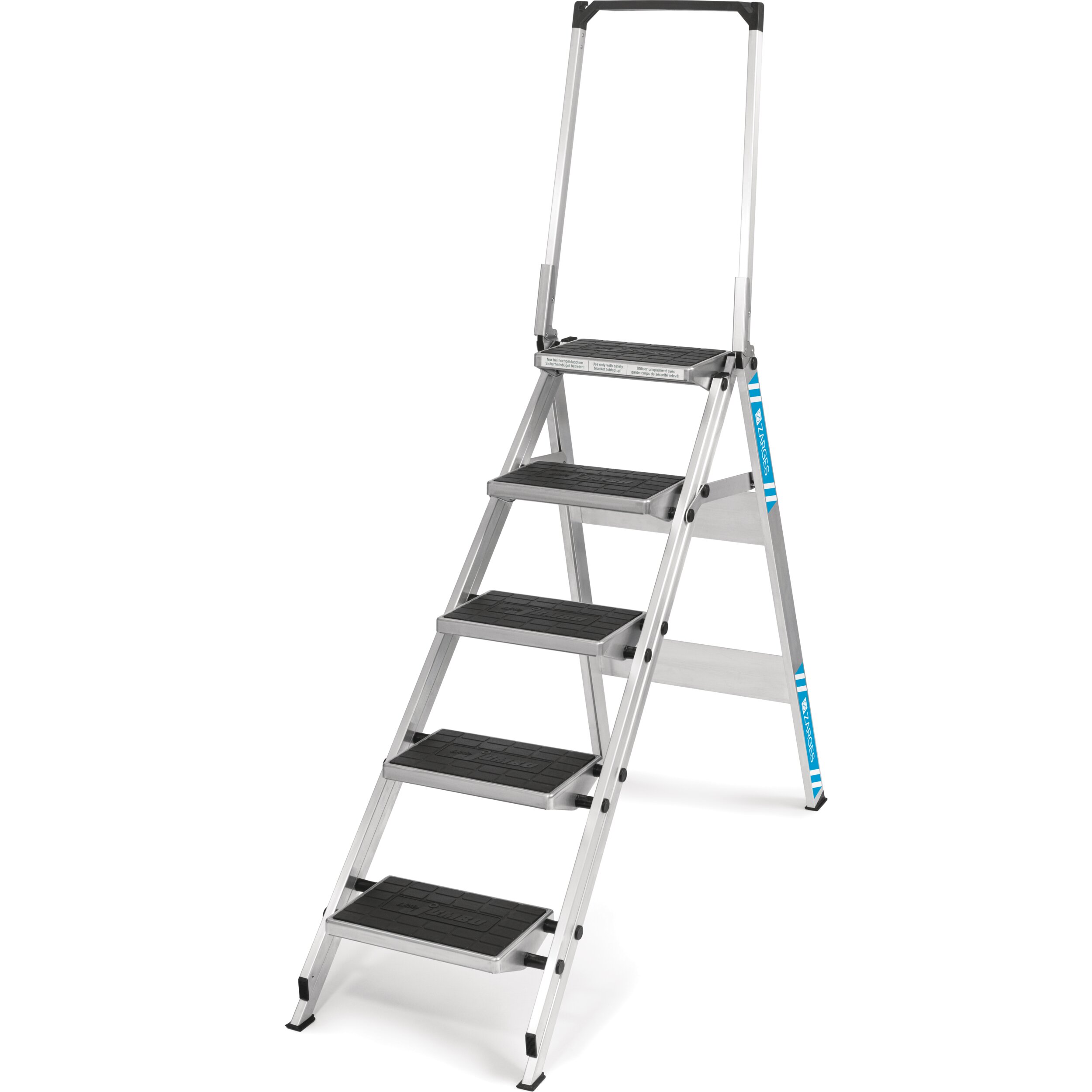 • Parapetto di sicurezza con pratica vaschetta portaoggetti, opzionali nella variante a 3 gradini, nella variante a 4 e 5 gradini il parapetto e le ruote sono applicati di serie sulla parte d'appoggio.