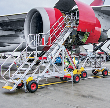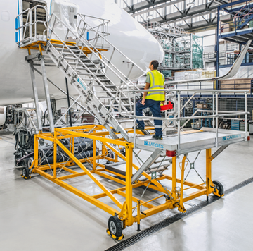 ZARGES Wartungstreppen mit verstellbaren Höhen eignen sich für eine Vielzahl von Wartungsaufgaben an Luftfahrzeugen. Sie sind mittels Hydraulikvorrichtungen leicht verstellbar und mühelos zu bewegen.