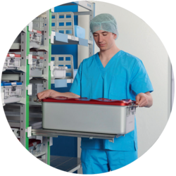Hier sind leichte, wendige und ergonomische Lösungen gefragt. Um möglichst viel Sterilgut unterzubringen und Laufwege zu minimieren muss das Volumen der Transportwagen optimal ausgenutzt werden können.