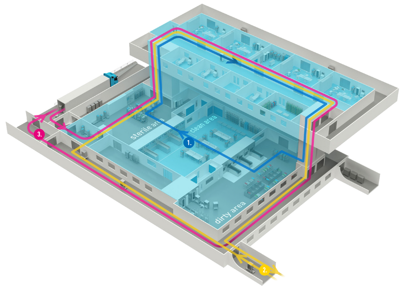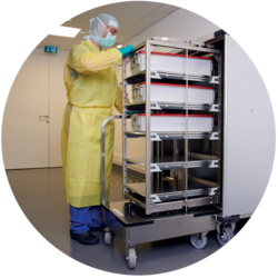 Beim Transport durch unreine Bereiche muss das Sterilgut sicher und kontaminationsfrei transportiert werden. Dies erfordert sorgfältig entwickelte Transportlösungen, die den strengen Hygienevorschriften entsprechen, das Risiko einer Kontamination minimieren und eine unkomplizierte, leichte Handhabung gewährleisten.