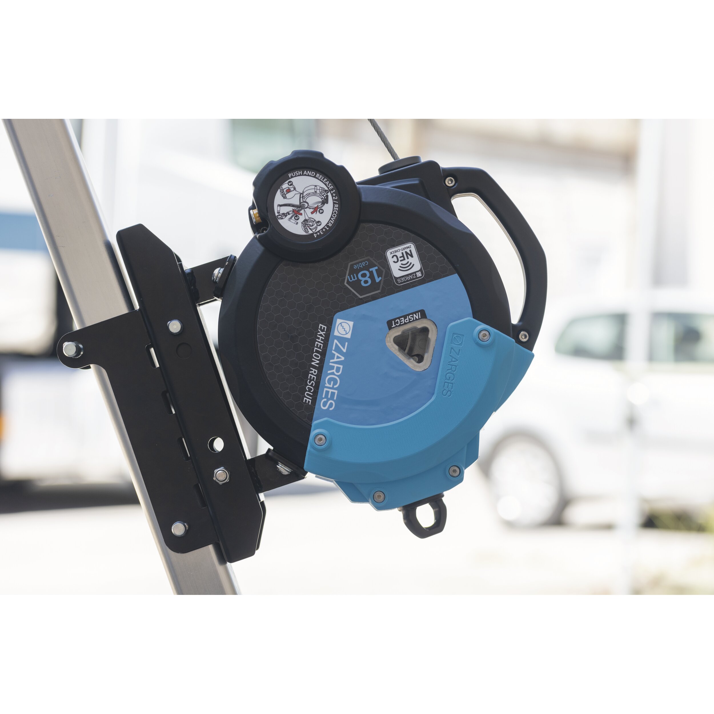 - Das Exhelon Höhensicherungsgerät mit Hubfunktion verfügt über ein 18 m langes, verzinktes Stahlseil und wird am Dreibein befestigt, um den sicheren Zugang zu engen Räumen zu ermöglichen. Es ist für Personen bis 150 kg zertifiziert, mit einem robusten Aluminiumgehäuse und einem ergonomischen Tragegriff ausgestattet. Die integrierte Kurbel erlaubt sowohl Rettungseinsätze als auch das kontrollierte Hochziehen. Geprüft nach EN 360:2023.