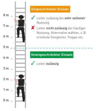 Werden Leitern selten und nur als Verkehrsweg, also Zugang zu einem Arbeitsplatz genutzt, sind auch Höhen über 5 m zulässig, die Arbeit auf der Leiter jedoch nicht! Erlaubt ist also:
