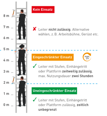 Zeitweilige Arbeiten sind Arbeiten, die einen Zeitraum von 2 Stunden je Arbeitsschicht nicht überschreiten. Bei Verwendung im Freien sind Umgebungs- und Witterungsverhältnisse zu berücksichtigen. Verwendung der Leiter als Zugang zu hochgelegenen Arbeitsplätzen ist weiterhin auch auf Sprossenleitern erlaubt.