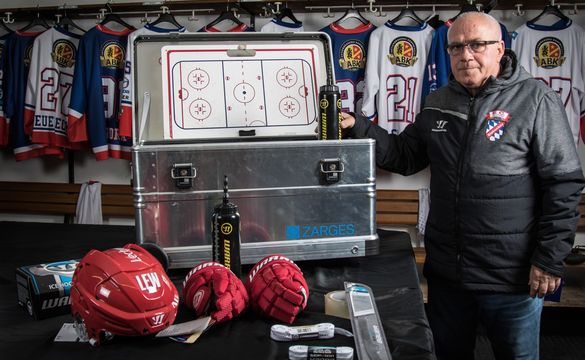 Zeugwart Emil Ries vom EC Peiting ist froh über die neuen Boxen von ZARGES. In ihnen kann die Ausrüstung sicher verstaut werden, die stabilen Aluminium-Kisten können dank der integrierten Rollen aber auch leicht transportiert werden.