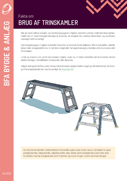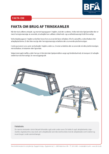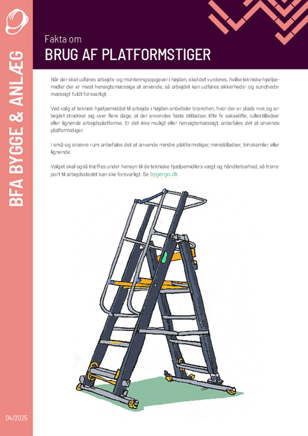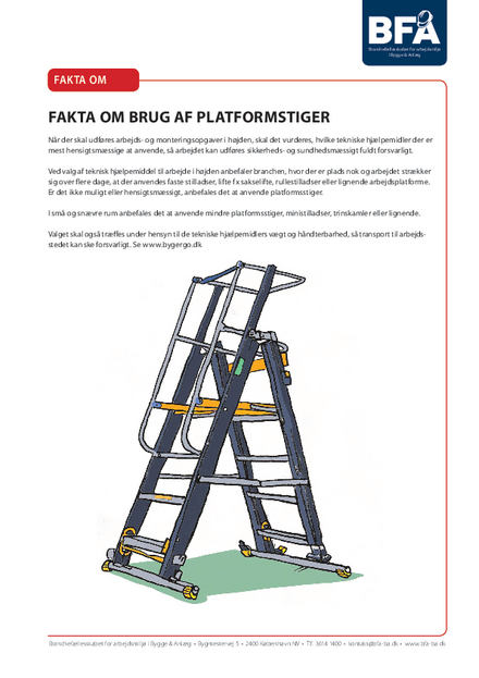 Når der skal udføres arbejds- og monteringsopgaver i højden, skal det vurderes, hvilke tekniske hjælpemidler der er mest hensigtsmæssige at anvende, så arbejdet kan udføres sikkerheds- og sundhedsmæssigt fuldt forsvarligt. Ved arbejdsopgaver i højden anbefaler BFA og ZARGES at der anvendes faste stilladser, lifte f.eks. sakselifte, rullestilladser eller lignende arbejdsplatforme. Er det ikke muligt eller hensigtsmæssigt, anbefales det at anvende platformsstiger. I små og snævre rum, samt ved arbejde i højder under ca. 2 meter anbefales det at anvende mindre platformsstiger, ministilladser, trinskamler eller lignende. ZARGES har Danmarks største udvalg af stiger hvor fra man kan arbejde i højden med begge hænder.
