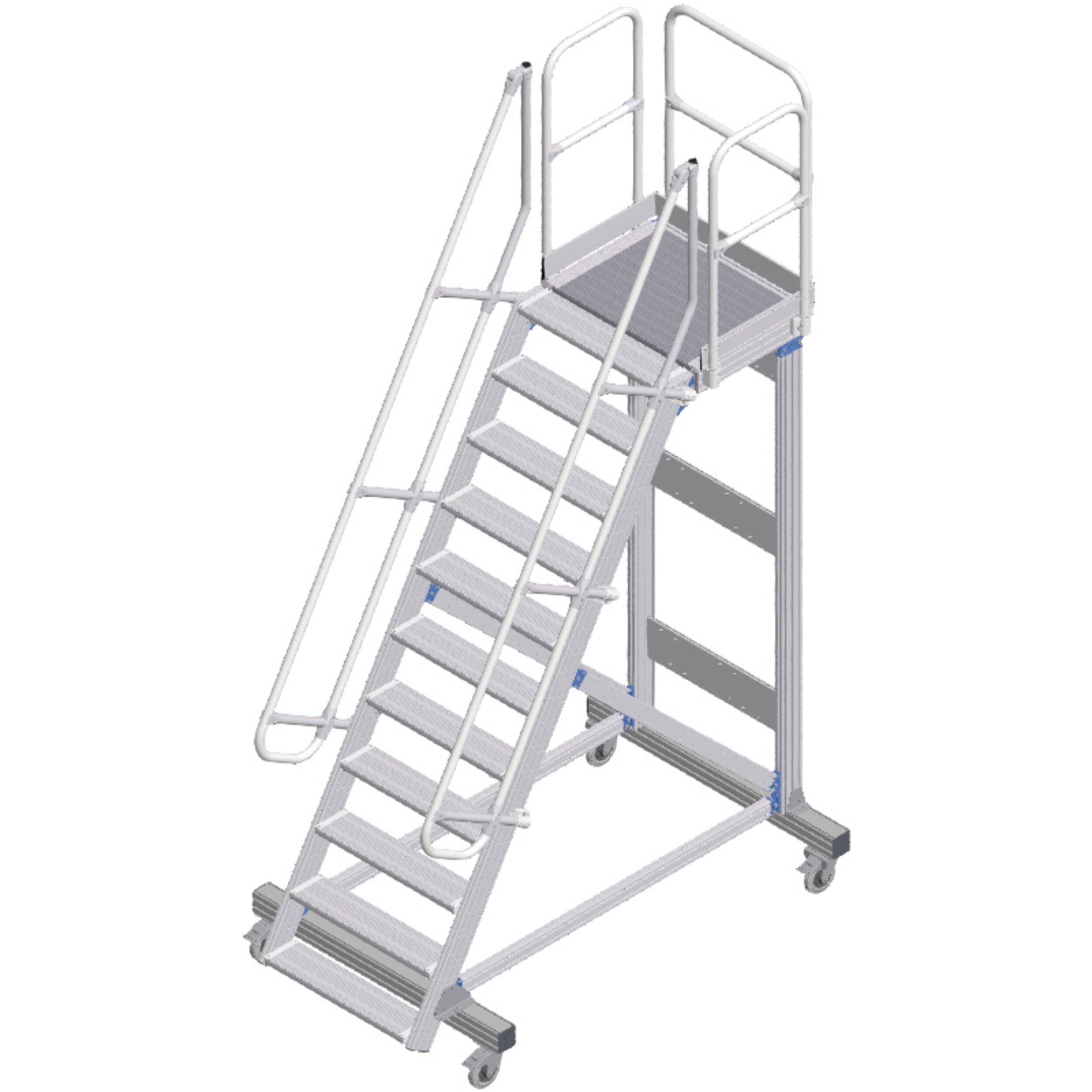 Mobile access or work platforms that offer comfortable ascent. Ideal for work over long periods, even with tools and frequent changes of working position. Large-area platform with guardrail for safe and ergonomic working at heights.