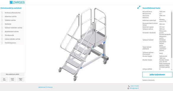ZARGES verkkosuunnitteluohjelma on jo kymmenen vuoden aikana auttanut käyttäjiä ympäri maailmaa löytämään tarpeeseensa sopivia räätälöityjä ratkaisuja. Järjestelmä opastaa käyttäjän vaihe vaiheelta suunnitteluprosessin läpi ja pyytää heiltä kaikki merkitykselliset tiedot loogisessa järjestyksessä. Yksi työkalun selkeistä eduista on, että suunnittelun suorittaminen on vaivatonta ja nopeaa, ja sitä paitsi saat myös tarjouksen nopeasti. Tämä tarkoittaa, että suunnitellut portaat ja työtasot ovat asiakkaan käytettävissä jo kahden viikon sisällä tilauksesta. Tämä on erottuva ominaisuus helppokäyttöisyyden ja nopeuden suhteen. Neuvontapalveluiden avulla asiakkaat hyötyvät myös ZARGESin kymmenen vuoden kokemuksesta verkkosuunnittelusta. Työkalua käytetään ympäri maailmaa ja se on käännetty 15 kielelle.