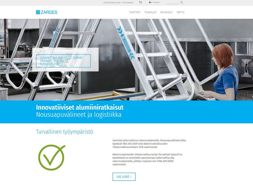 Zarges päivittää nettisivujaan parantaakseen asiakkaiden käyttökokemusta. Jatkossa asiakkaat saavat esim. tuotteiden tekniset tiedot suomeksi. Asiakkailla on nyt myös helpompi selata tuotteita ja löytää etsimänsä. Zarges.fi -sivustolla löytyy myös verkkosuunnittelutyökalu, jonka avulla asiakkailla on helppo suunnitella juuri tarpeisiinsa sopivat työtasot, portaat, työjakkarat ja ylikulkusillat.