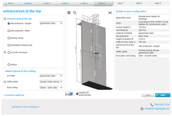 The ZARGES online configurator helps users find the solution they need by guiding them through the individual steps on their screen and asking them to provide all relevant information in a logical sequence. It is particularly convenient for everyone involved: the process takes just a short time to complete and allows ZARGES to draw up an offer quickly and effortlessly. As a result, access systems can be delivered and commissioned for use on a customer's premise within just around ten days – a unique feature in terms of user-friendliness and time saving.