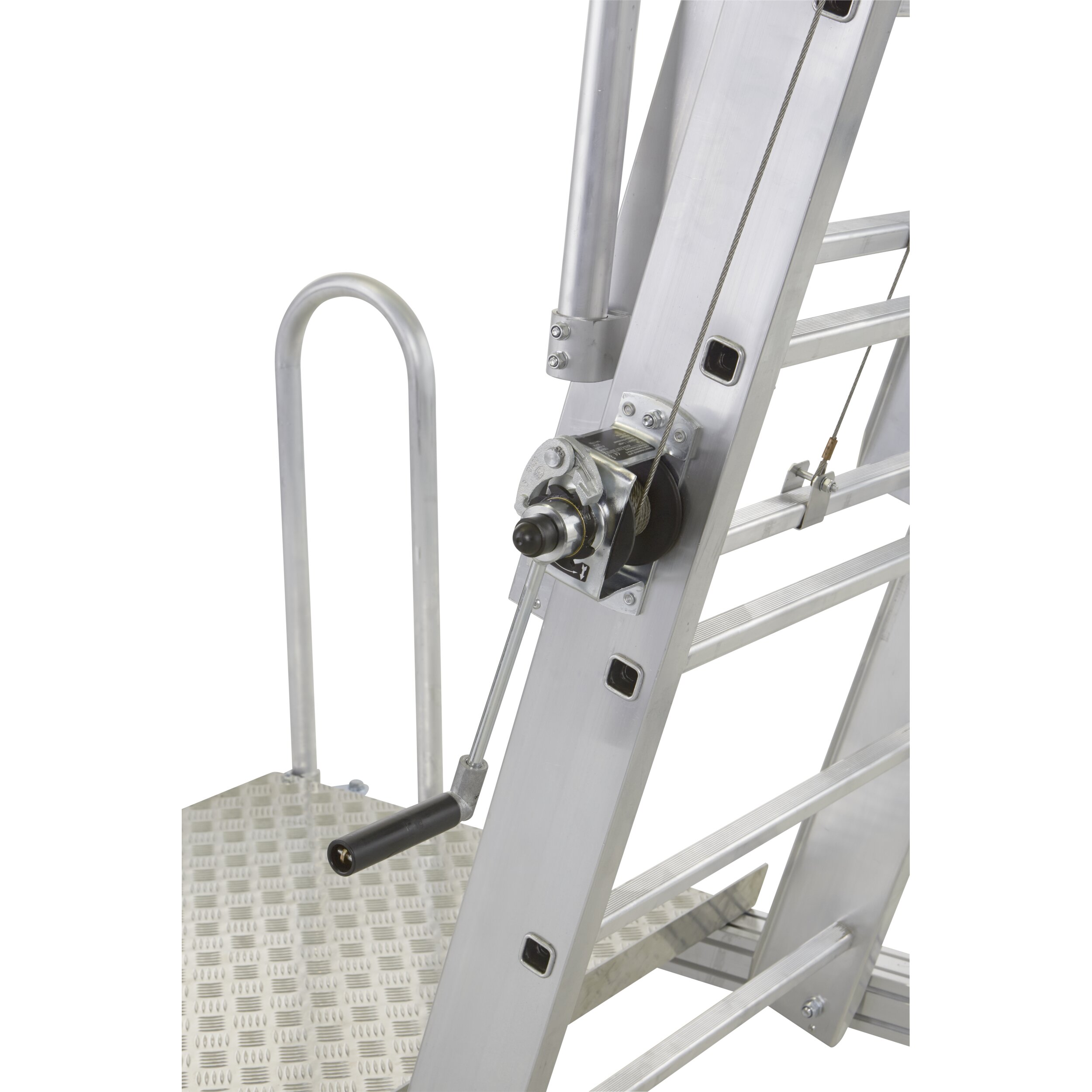 - Wygodna regulacja wysokości z rastrem 280 mm za pomocą dwuczęściowej drabiny rozsuwanej i wciągarki linowej.