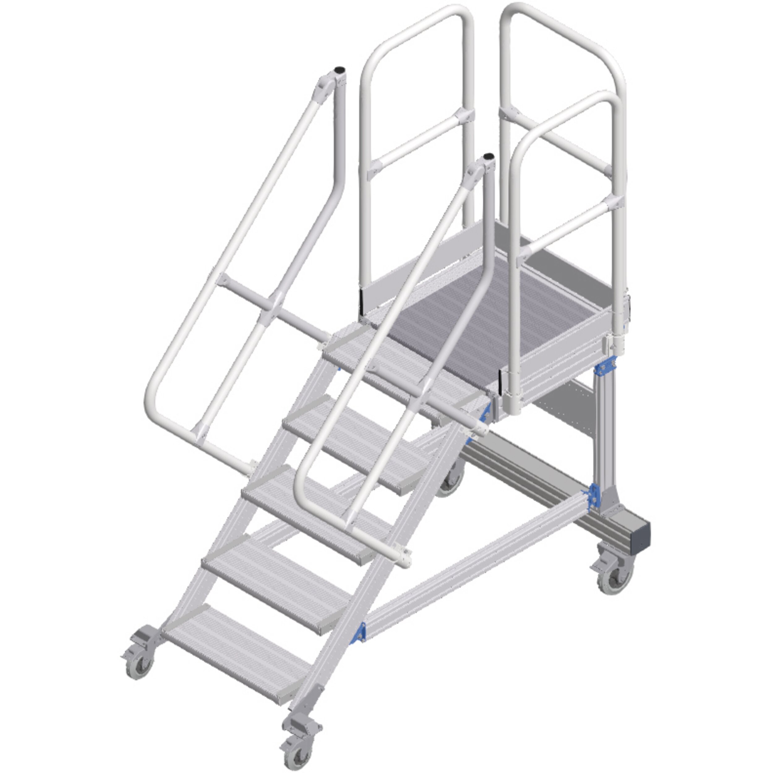 Mobilna platforma dojściowa i robocza z wygodnym wejściem. Nadaje się idealnie do dłuższych prac, także z narzędziami i częstymi zmianami miejsca pracy. Wielkopowierzchniowa platforma z balustradą zapewniająca bezpieczeństwo i ergonomię pracy na dużych wysokościach.