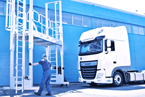 Höjdjusterbar arbetsplattform för underhåll på nyttofordon och bussar.