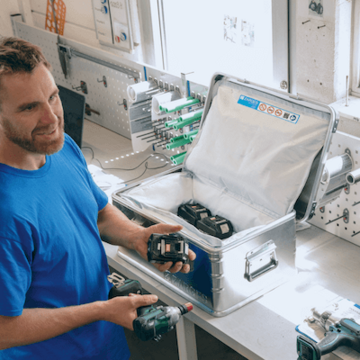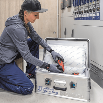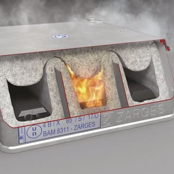 TÜV-godkända batterilådor för säker lagring och transport av litiumbatterier och farligt gods. Skyddar mot externa skador vid eventuell brand.
