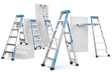 Enkelstege och förlängd enkelstege: Den innovativa stegtoppen kan säkert lutas mot inre och yttre hörn, stolpar, pelare, regelväggar och plana väggytor.