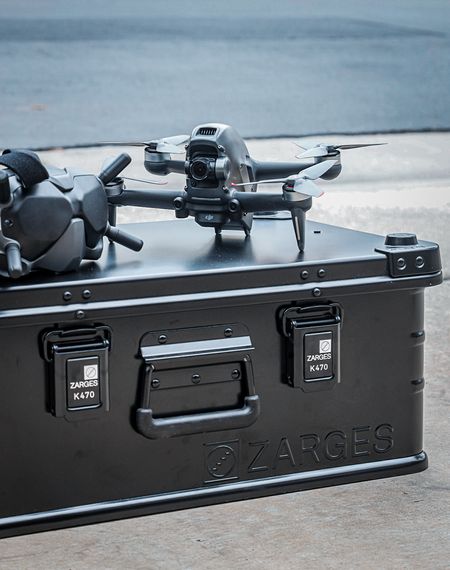 Säker transport och förvaring av drönare: Den lätta och robusta aluminiumlådan med tillhörande skumset.