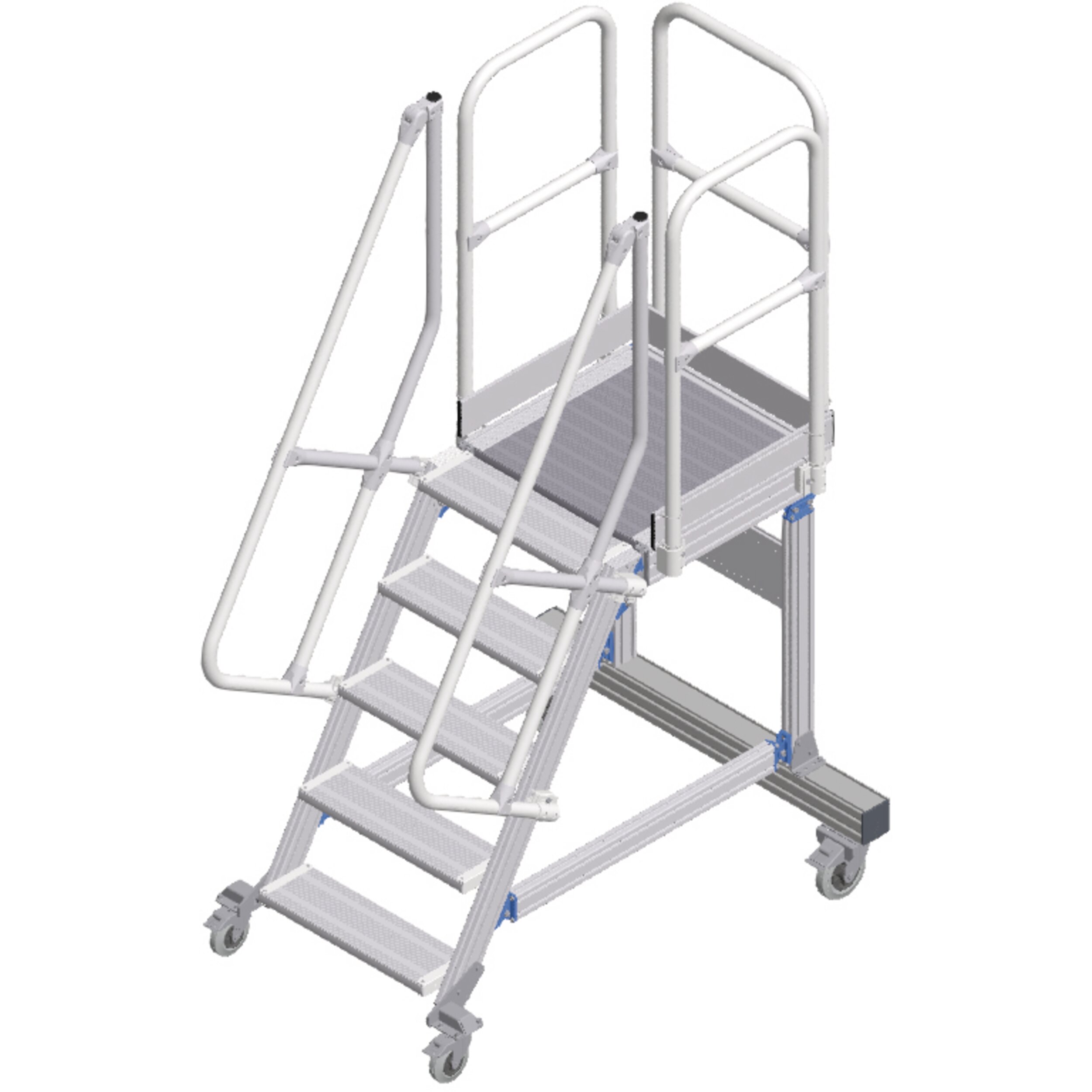 Mobil erişim veya çalışma platformu, konforlu tırmanma olanaklı. Uzun süren çalışmalar için ideal düzeyde uygundur, aletle ve çalışma alanının sıkça değiştirildiği durumlarda da. Yüksekte güvenli ve ergonomik şekilde çalışmak için korkuluklu büyük yüzeyli platform.
