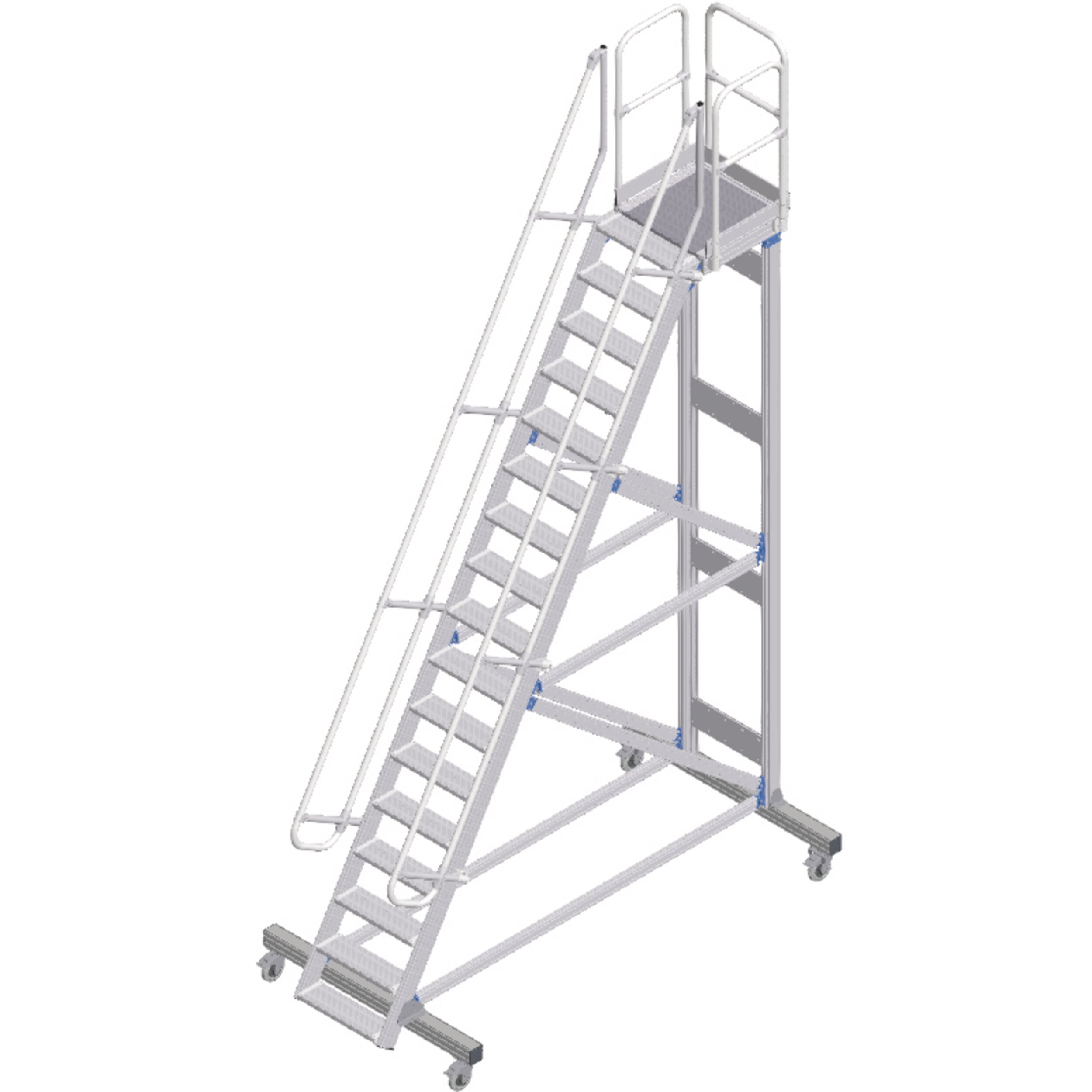 Mobil erişim veya çalışma platformu, konforlu tırmanma olanaklı. Uzun süren çalışmalar için ideal düzeyde uygundur, aletle ve çalışma alanının sıkça değiştirildiği durumlarda da. Yüksekte güvenli ve ergonomik şekilde çalışmak için korkuluklu büyük yüzeyli platform.