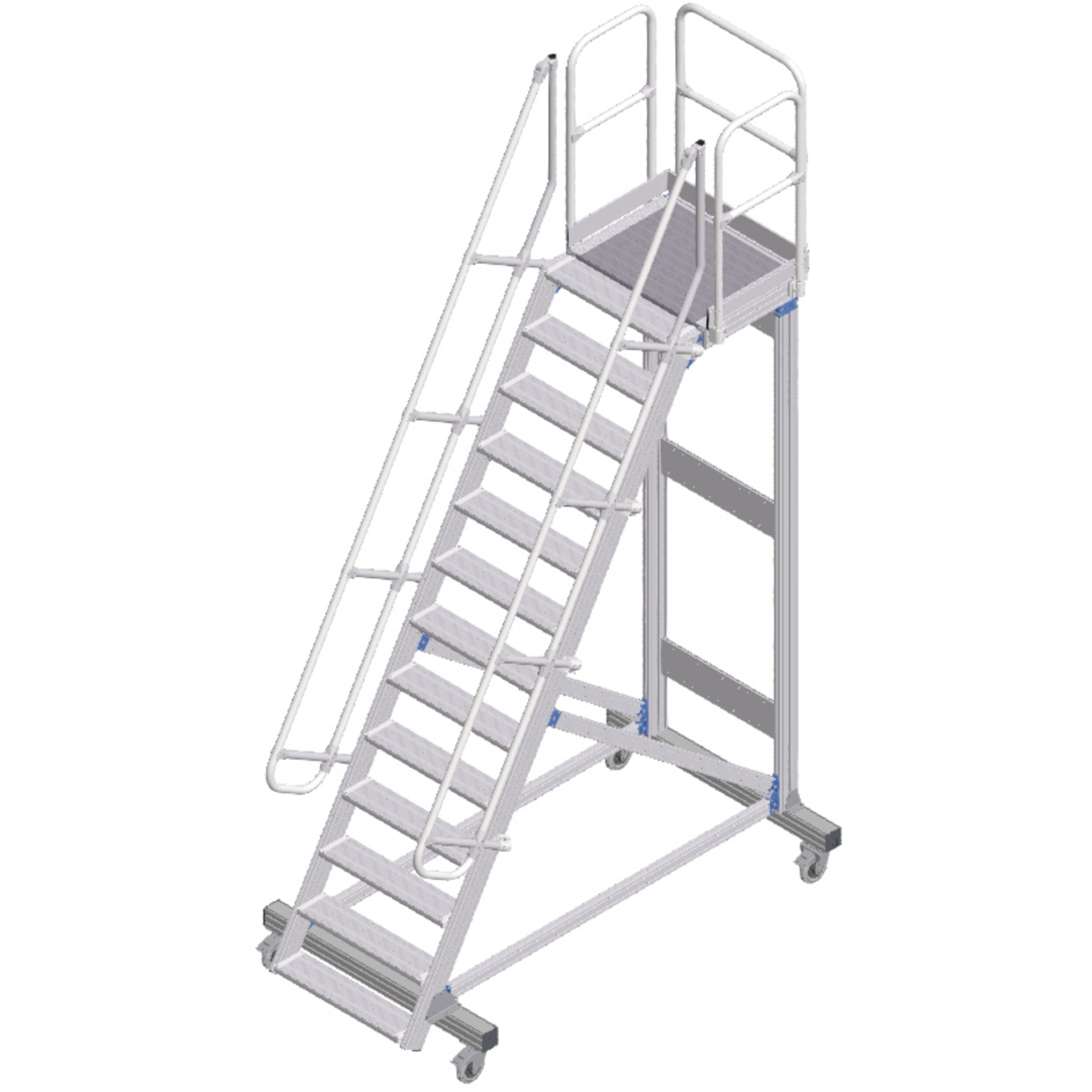 Mobil erişim veya çalışma platformu, konforlu tırmanma olanaklı. Uzun süren çalışmalar için ideal düzeyde uygundur, aletle ve çalışma alanının sıkça değiştirildiği durumlarda da. Yüksekte güvenli ve ergonomik şekilde çalışmak için korkuluklu büyük yüzeyli platform.