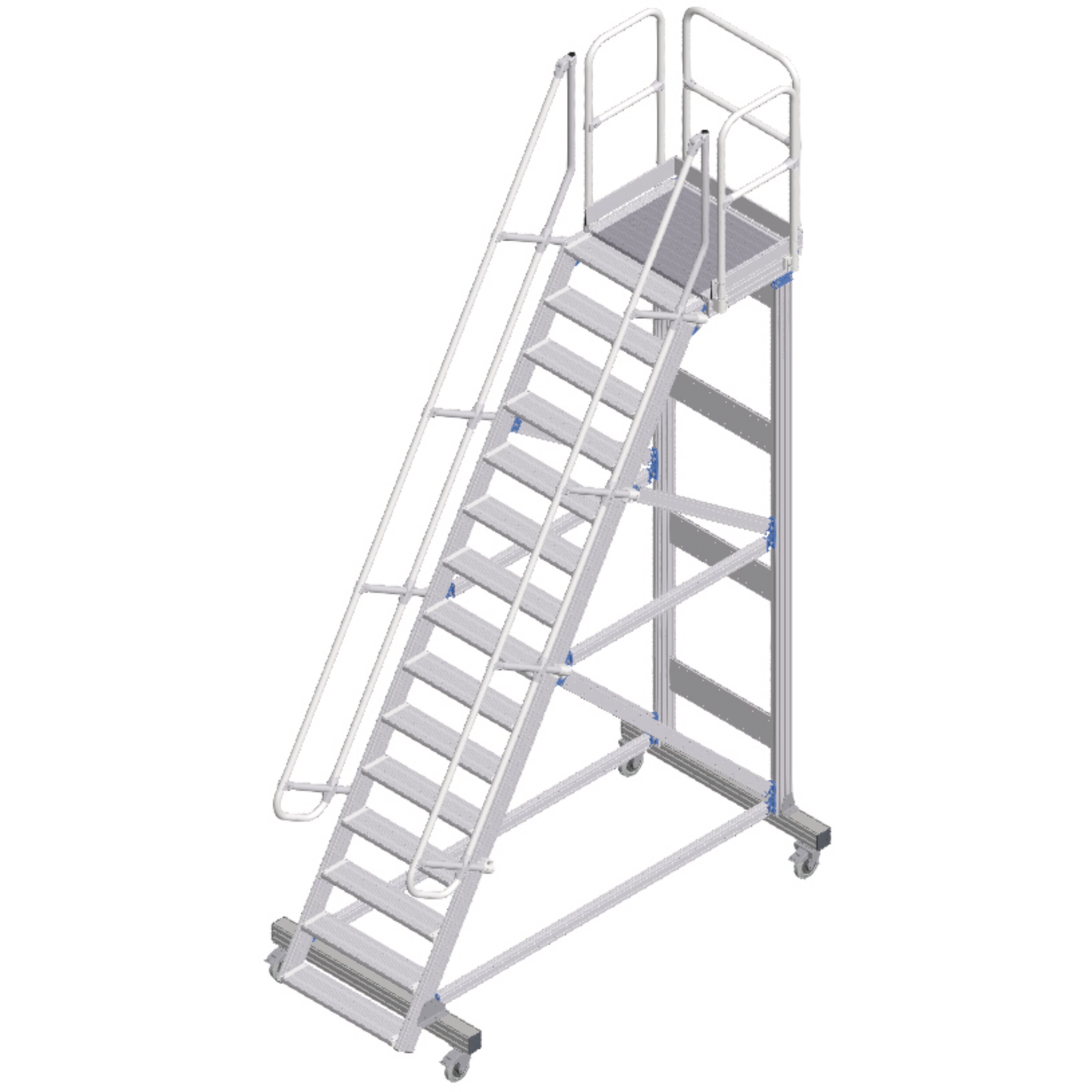 Mobil erişim veya çalışma platformu, konforlu tırmanma olanaklı. Uzun süren çalışmalar için ideal düzeyde uygundur, aletle ve çalışma alanının sıkça değiştirildiği durumlarda da. Yüksekte güvenli ve ergonomik şekilde çalışmak için korkuluklu büyük yüzeyli platform.