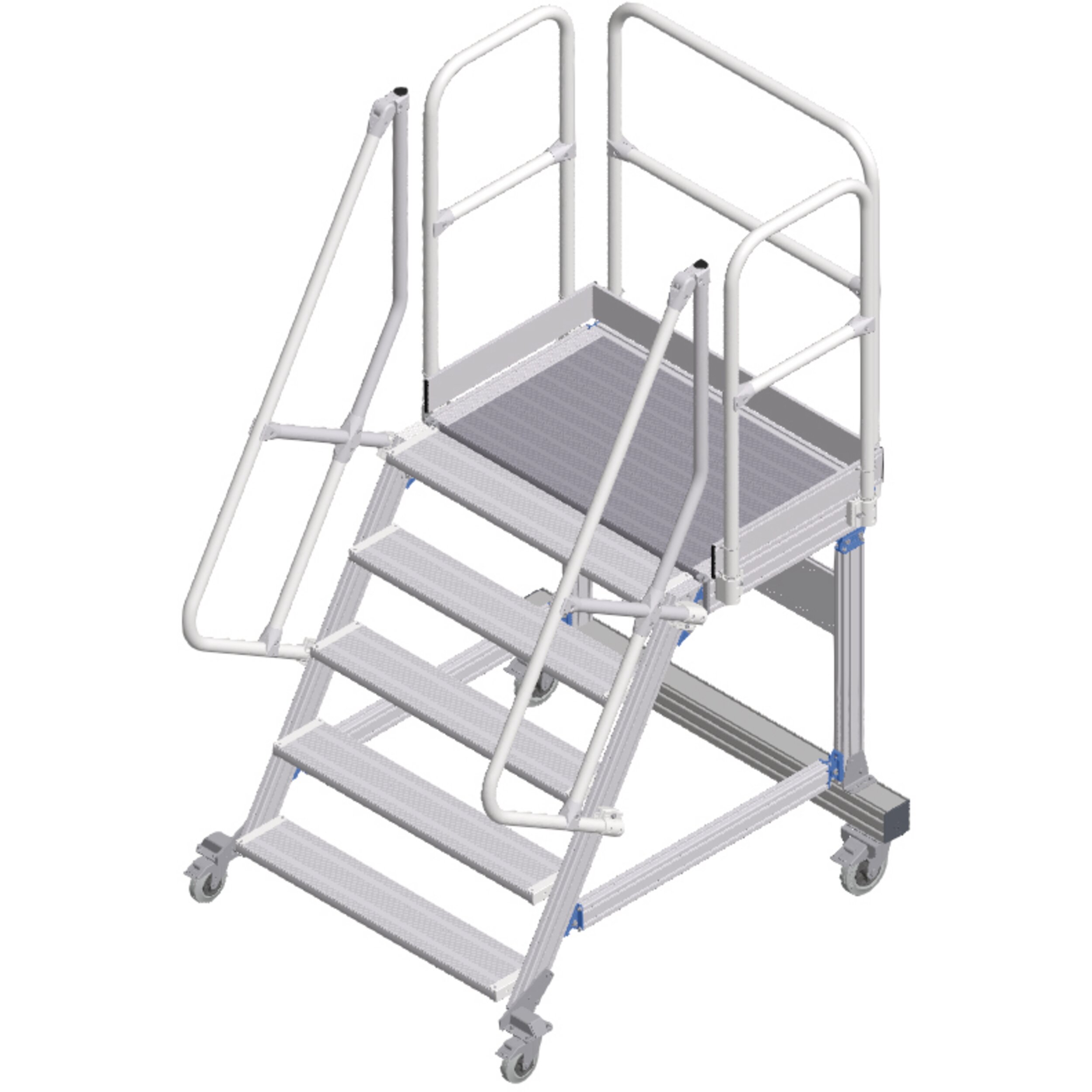 Mobil erişim veya çalışma platformu, konforlu tırmanma olanaklı. Uzun süren çalışmalar için ideal düzeyde uygundur, aletle ve çalışma alanının sıkça değiştirildiği durumlarda da. Yüksekte güvenli ve ergonomik şekilde çalışmak için korkuluklu büyük yüzeyli platform.