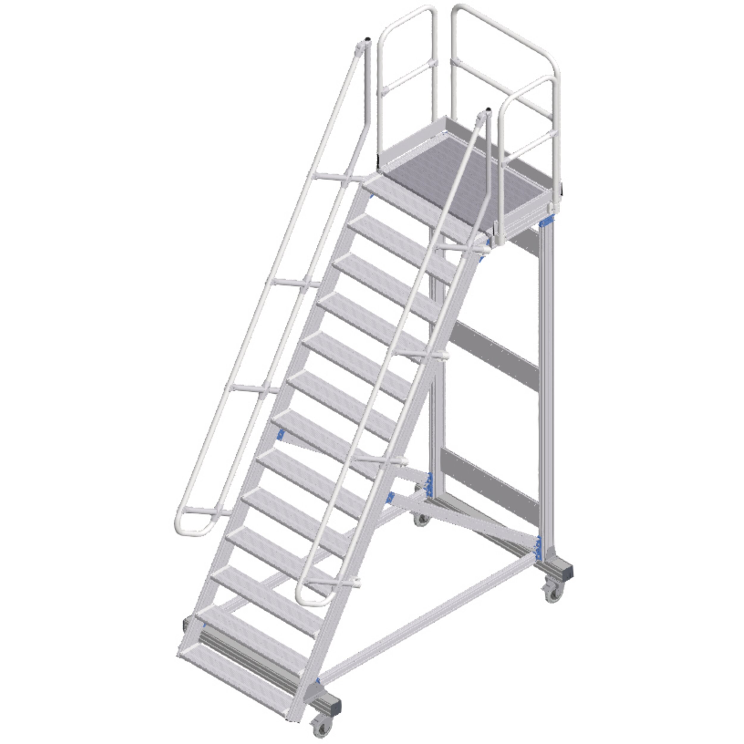 Mobil erişim veya çalışma platformu, konforlu tırmanma olanaklı. Uzun süren çalışmalar için ideal düzeyde uygundur, aletle ve çalışma alanının sıkça değiştirildiği durumlarda da. Yüksekte güvenli ve ergonomik şekilde çalışmak için korkuluklu büyük yüzeyli platform.