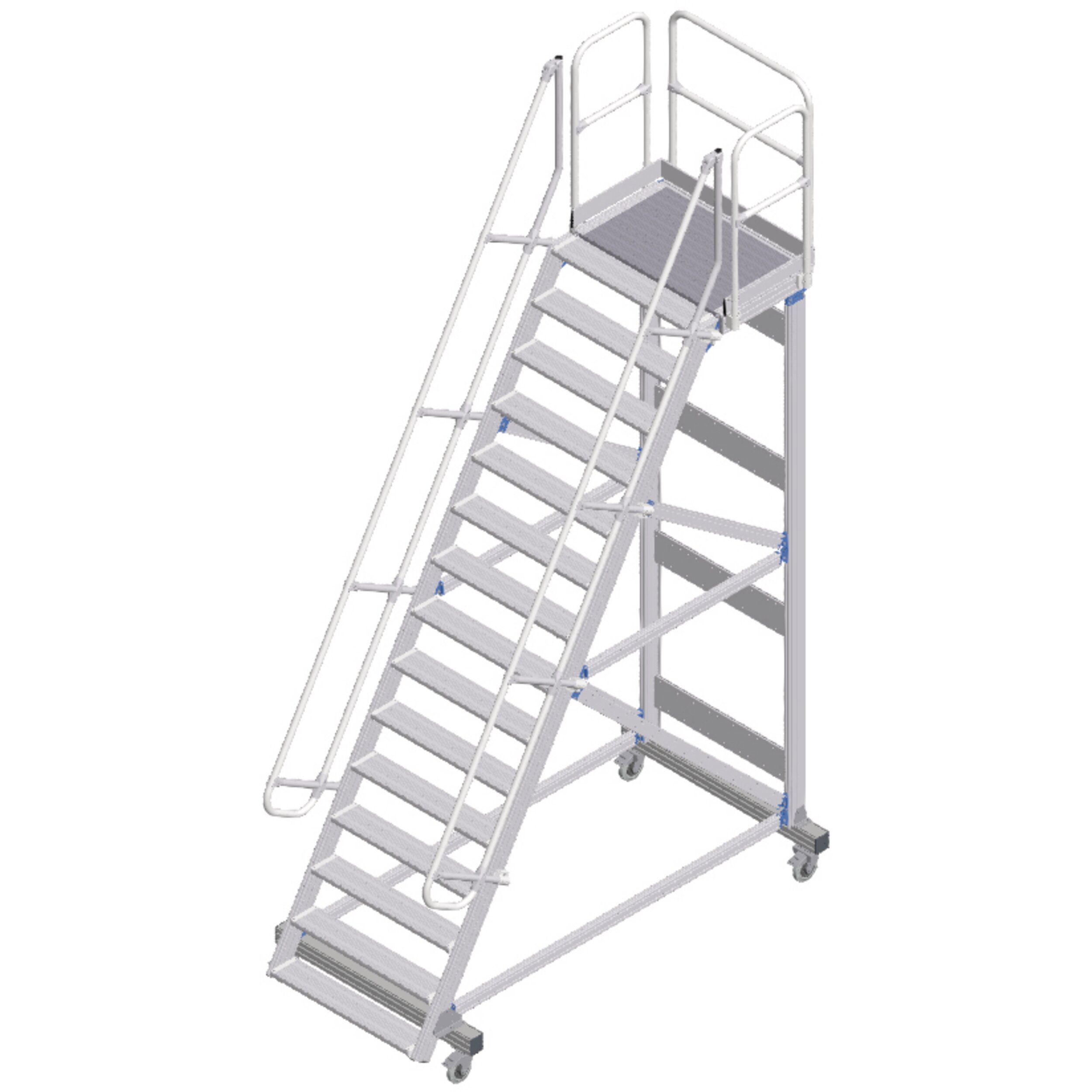 Mobil erişim veya çalışma platformu, konforlu tırmanma olanaklı. Uzun süren çalışmalar için ideal düzeyde uygundur, aletle ve çalışma alanının sıkça değiştirildiği durumlarda da. Yüksekte güvenli ve ergonomik şekilde çalışmak için korkuluklu büyük yüzeyli platform.