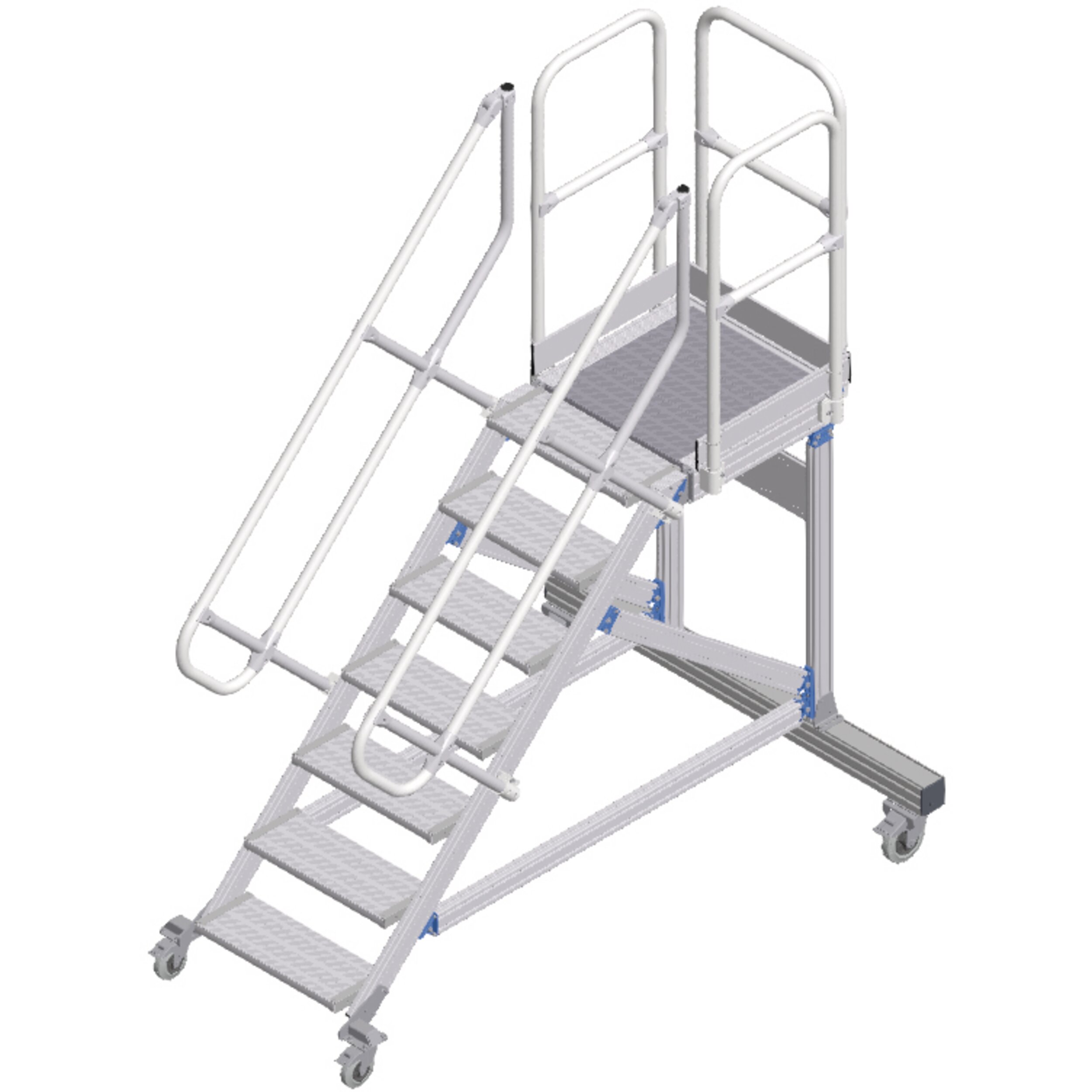 Mobil erişim veya çalışma platformu, konforlu tırmanma olanaklı. Uzun süren çalışmalar için ideal düzeyde uygundur, aletle ve çalışma alanının sıkça değiştirildiği durumlarda da. Yüksekte güvenli ve ergonomik şekilde çalışmak için korkuluklu büyük yüzeyli platform.