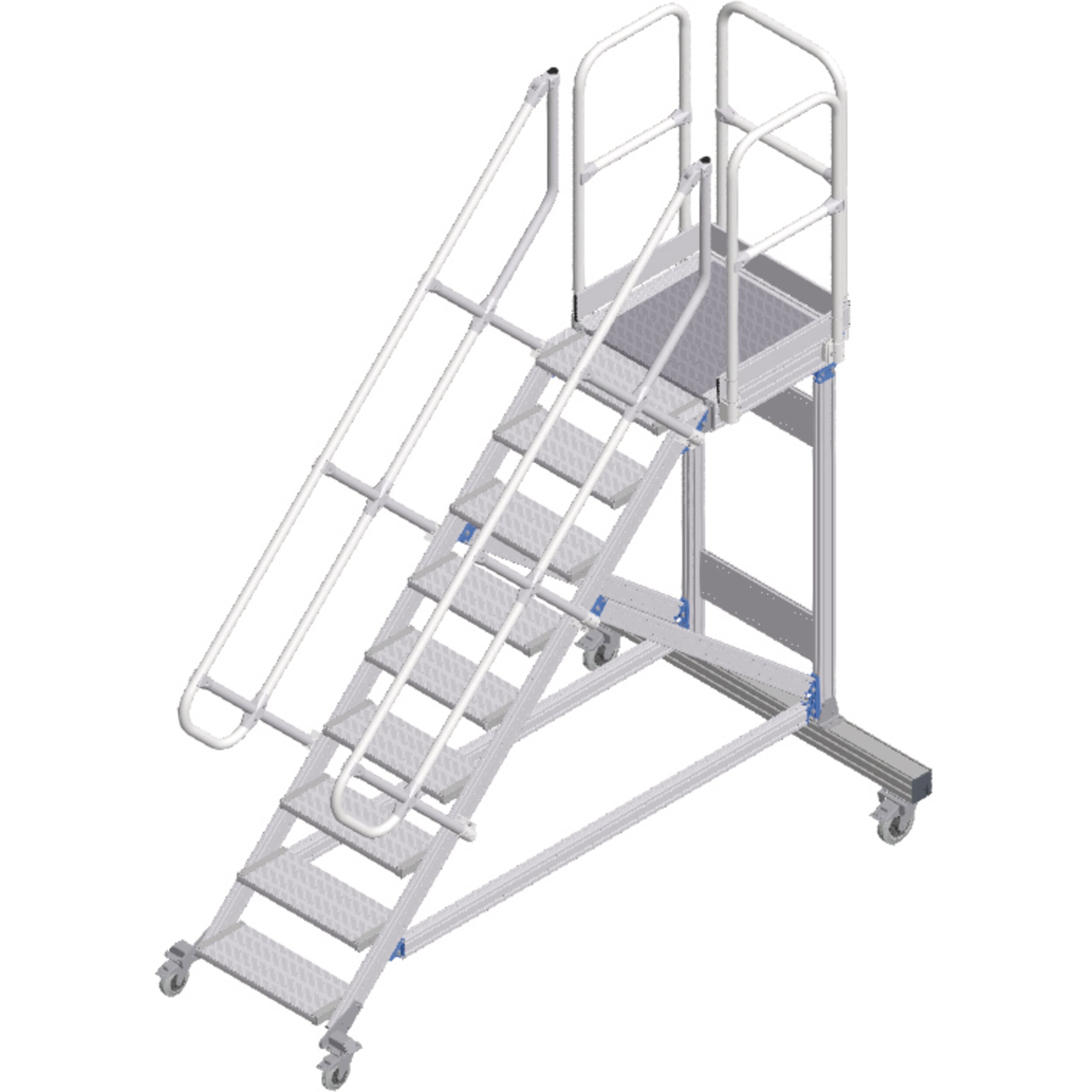 Mobil erişim veya çalışma platformu, konforlu tırmanma olanaklı. Uzun süren çalışmalar için ideal düzeyde uygundur, aletle ve çalışma alanının sıkça değiştirildiği durumlarda da. Yüksekte güvenli ve ergonomik şekilde çalışmak için korkuluklu büyük yüzeyli platform.