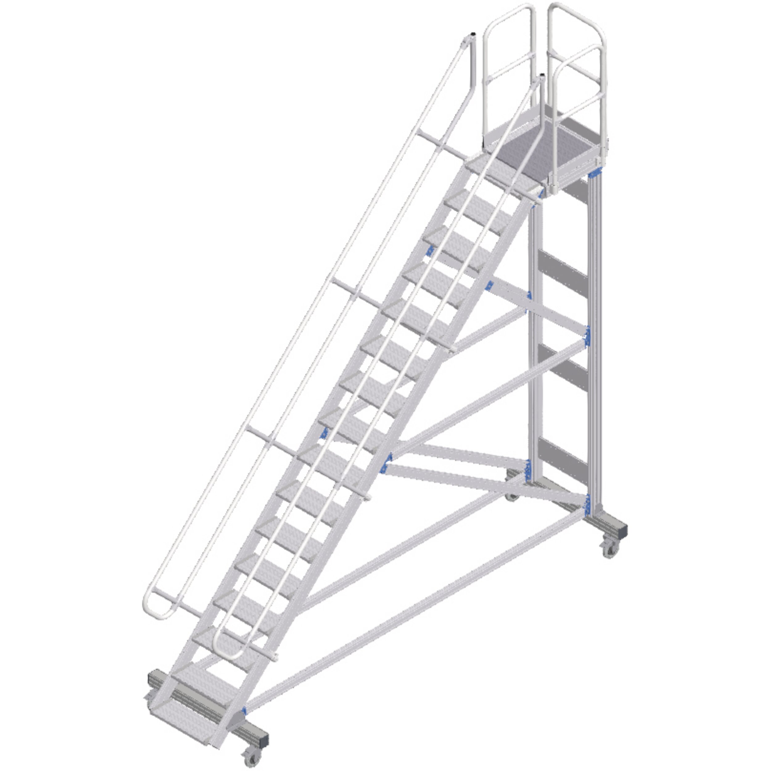 Mobil erişim veya çalışma platformu, konforlu tırmanma olanaklı. Uzun süren çalışmalar için ideal düzeyde uygundur, aletle ve çalışma alanının sıkça değiştirildiği durumlarda da. Yüksekte güvenli ve ergonomik şekilde çalışmak için korkuluklu büyük yüzeyli platform.