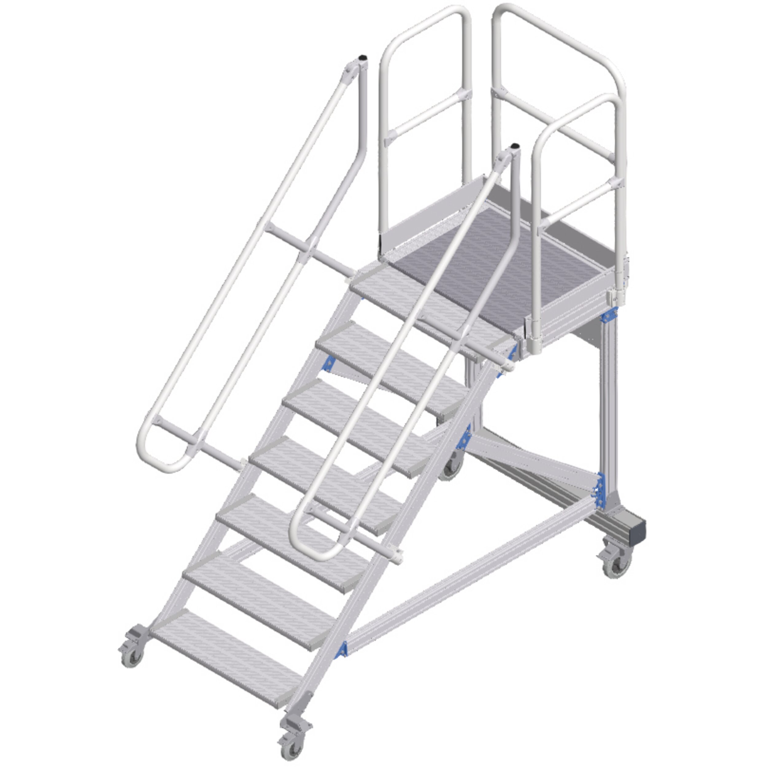 Mobil erişim veya çalışma platformu, konforlu tırmanma olanaklı. Uzun süren çalışmalar için ideal düzeyde uygundur, aletle ve çalışma alanının sıkça değiştirildiği durumlarda da. Yüksekte güvenli ve ergonomik şekilde çalışmak için korkuluklu büyük yüzeyli platform.