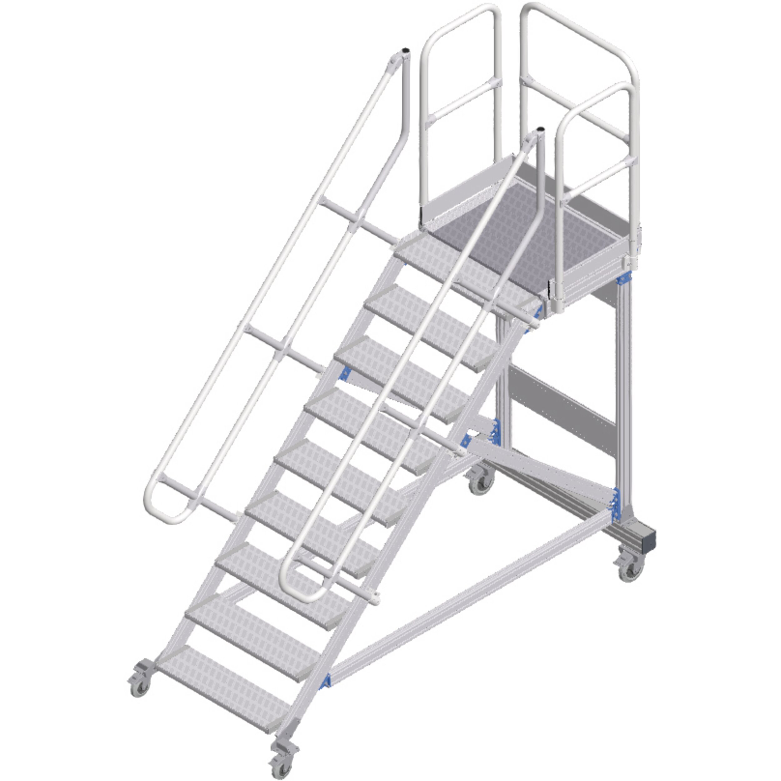 Mobil erişim veya çalışma platformu, konforlu tırmanma olanaklı. Uzun süren çalışmalar için ideal düzeyde uygundur, aletle ve çalışma alanının sıkça değiştirildiği durumlarda da. Yüksekte güvenli ve ergonomik şekilde çalışmak için korkuluklu büyük yüzeyli platform.