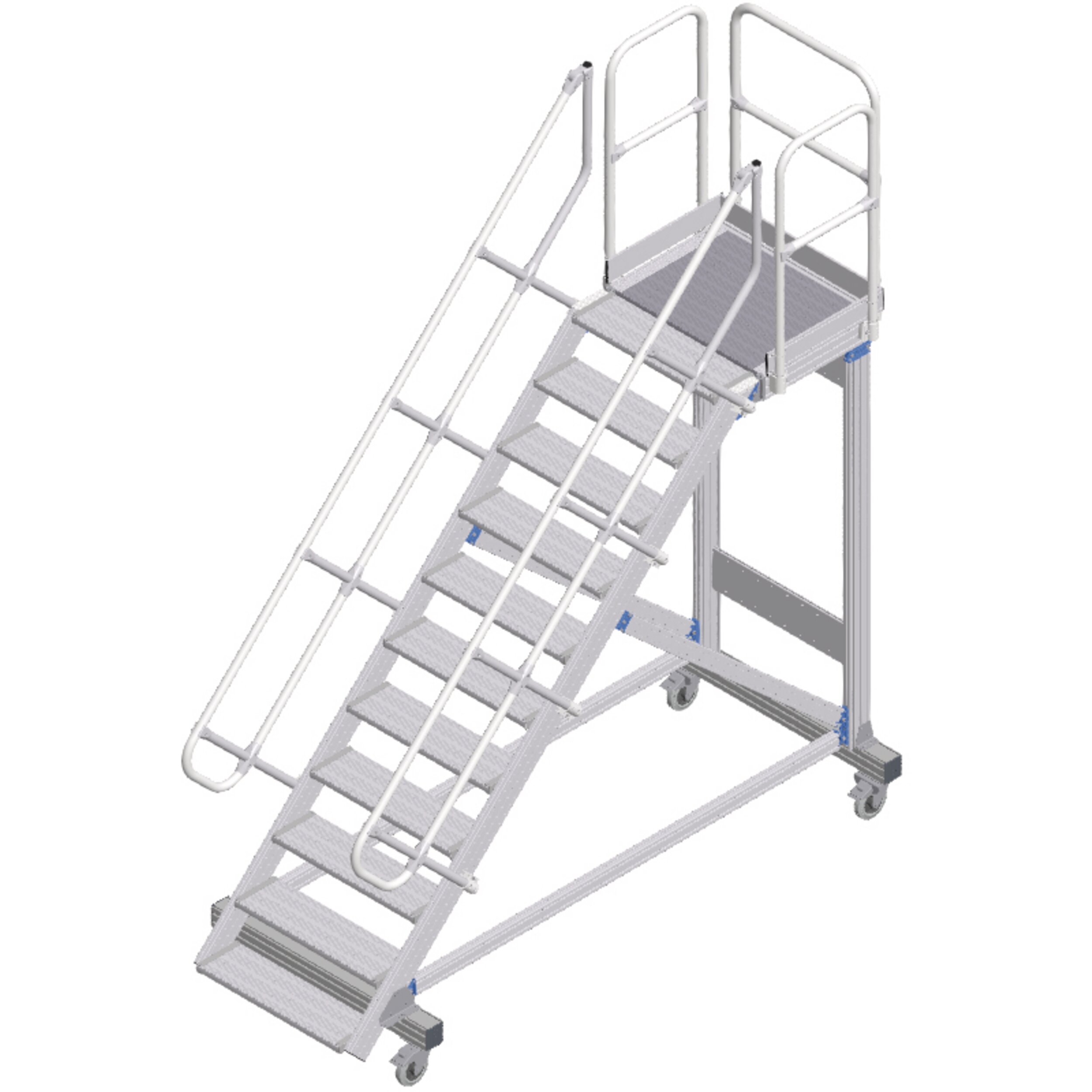 Mobil erişim veya çalışma platformu, konforlu tırmanma olanaklı. Uzun süren çalışmalar için ideal düzeyde uygundur, aletle ve çalışma alanının sıkça değiştirildiği durumlarda da. Yüksekte güvenli ve ergonomik şekilde çalışmak için korkuluklu büyük yüzeyli platform.