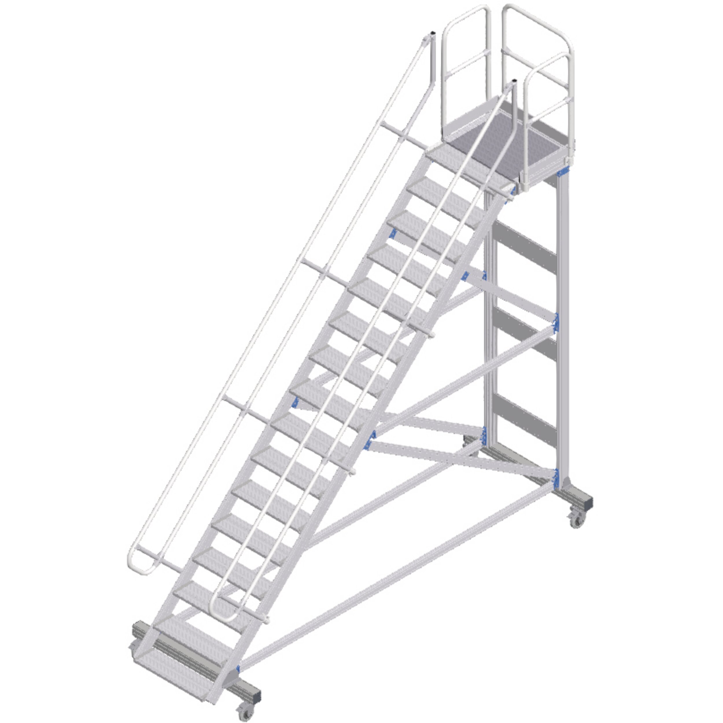 Mobil erişim veya çalışma platformu, konforlu tırmanma olanaklı. Uzun süren çalışmalar için ideal düzeyde uygundur, aletle ve çalışma alanının sıkça değiştirildiği durumlarda da. Yüksekte güvenli ve ergonomik şekilde çalışmak için korkuluklu büyük yüzeyli platform.