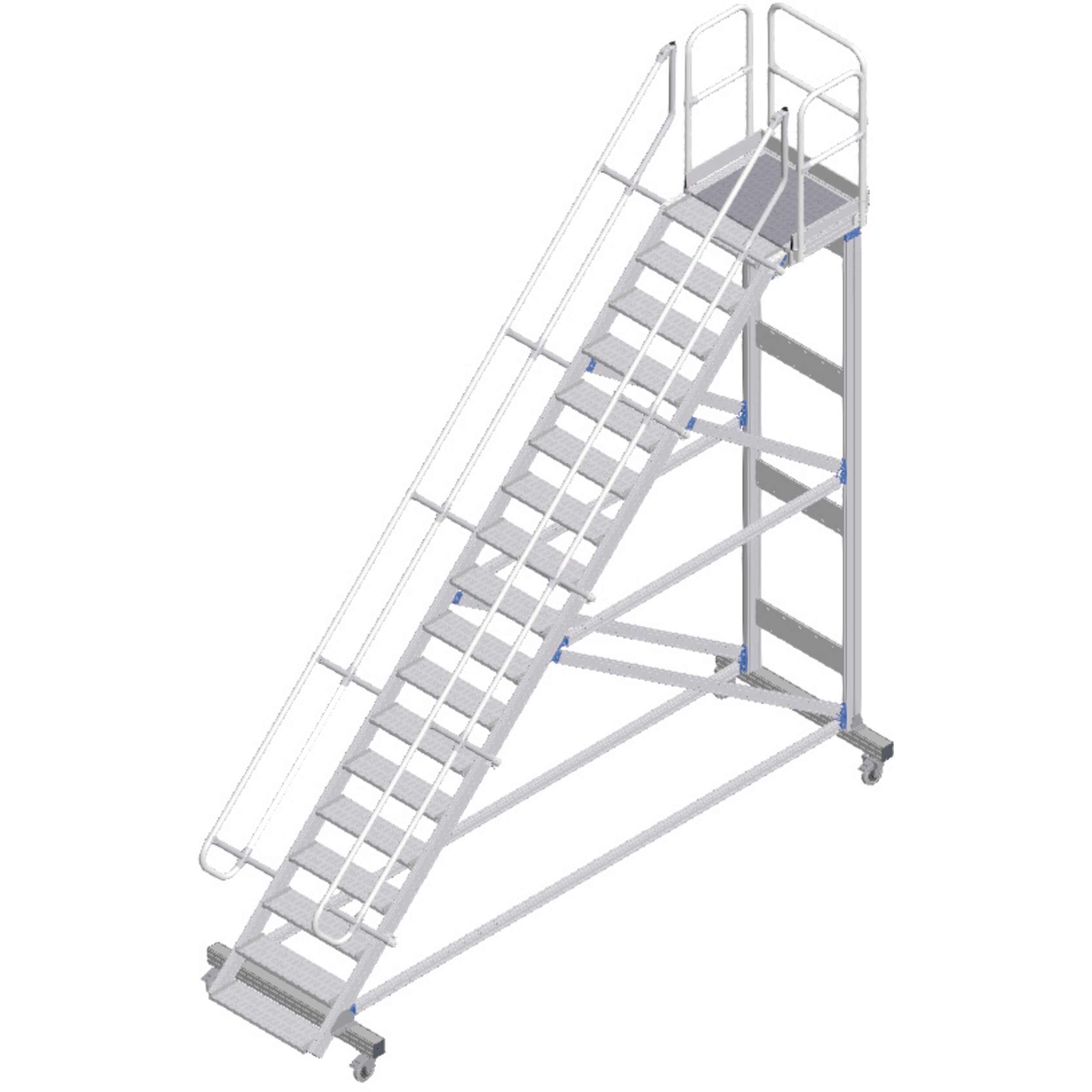 Mobil erişim veya çalışma platformu, konforlu tırmanma olanaklı. Uzun süren çalışmalar için ideal düzeyde uygundur, aletle ve çalışma alanının sıkça değiştirildiği durumlarda da. Yüksekte güvenli ve ergonomik şekilde çalışmak için korkuluklu büyük yüzeyli platform.