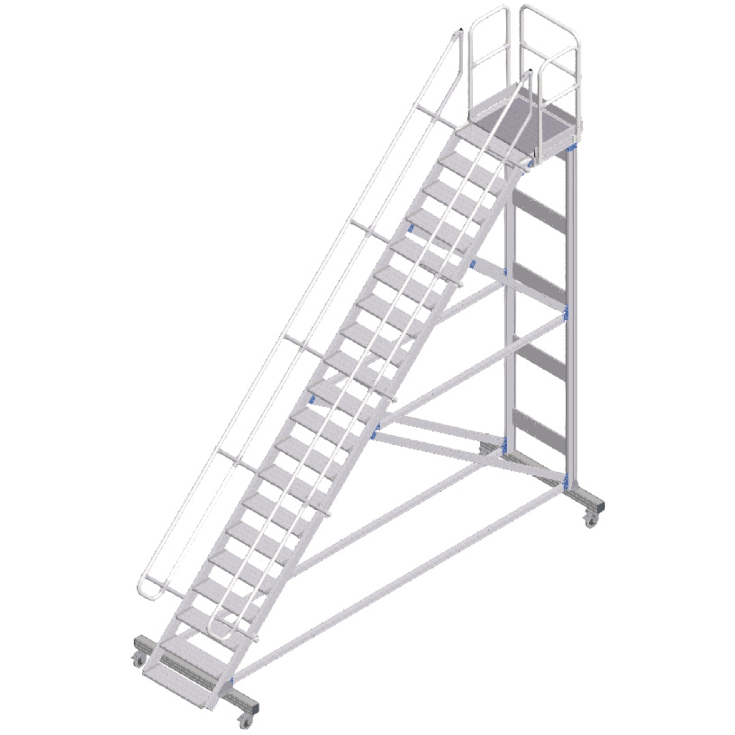Mobil erişim veya çalışma platformu, konforlu tırmanma olanaklı. Uzun süren çalışmalar için ideal düzeyde uygundur, aletle ve çalışma alanının sıkça değiştirildiği durumlarda da. Yüksekte güvenli ve ergonomik şekilde çalışmak için korkuluklu büyük yüzeyli platform.