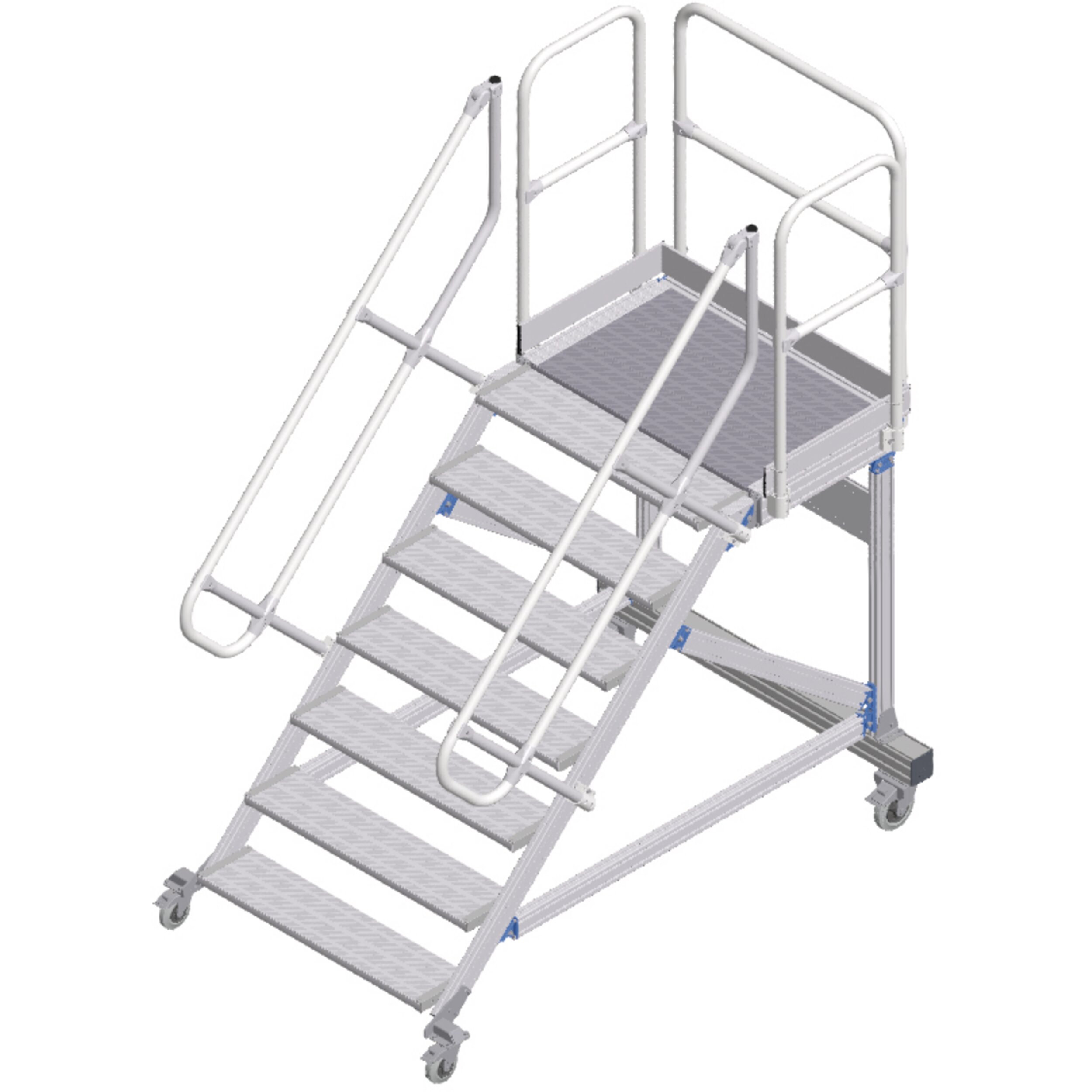 Mobil erişim veya çalışma platformu, konforlu tırmanma olanaklı. Uzun süren çalışmalar için ideal düzeyde uygundur, aletle ve çalışma alanının sıkça değiştirildiği durumlarda da. Yüksekte güvenli ve ergonomik şekilde çalışmak için korkuluklu büyük yüzeyli platform.