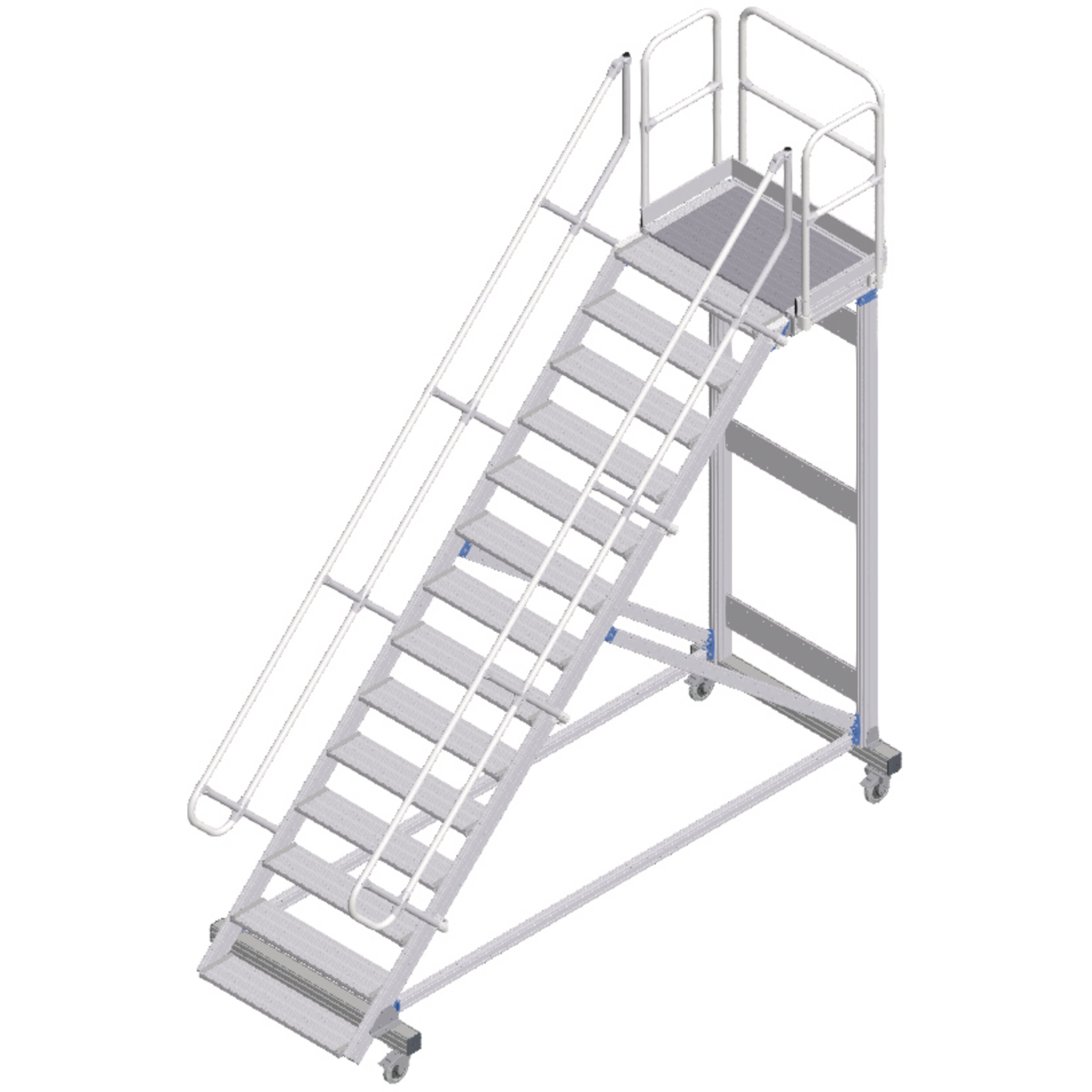 Mobil erişim veya çalışma platformu, konforlu tırmanma olanaklı. Uzun süren çalışmalar için ideal düzeyde uygundur, aletle ve çalışma alanının sıkça değiştirildiği durumlarda da. Yüksekte güvenli ve ergonomik şekilde çalışmak için korkuluklu büyük yüzeyli platform.