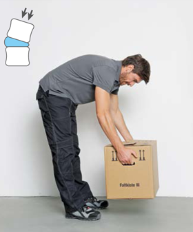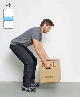 The spine has a supporting function and is not a joint. For this reason, the spinal column is stabilised by the back and core muscles which are designed to relieve the strain on joints and ligaments, but above all on spinal discs. Lifting heavy loads creates tension and pressure to the fibrous ring of the spinal discs. A load of 50 kg places 900 kg of pressure onto the spinal discs. Constant stress due to incorrect lifting leads to tearing of the ring and consequently to a herniated disc.