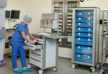 Allt måste vara snabbt tillgängligt i operationssalen. Förseningar orsakade av felaktigt eller saknat material är särskilt kostsamma. Vi erbjuder fasta och mobila lösningar för detta.